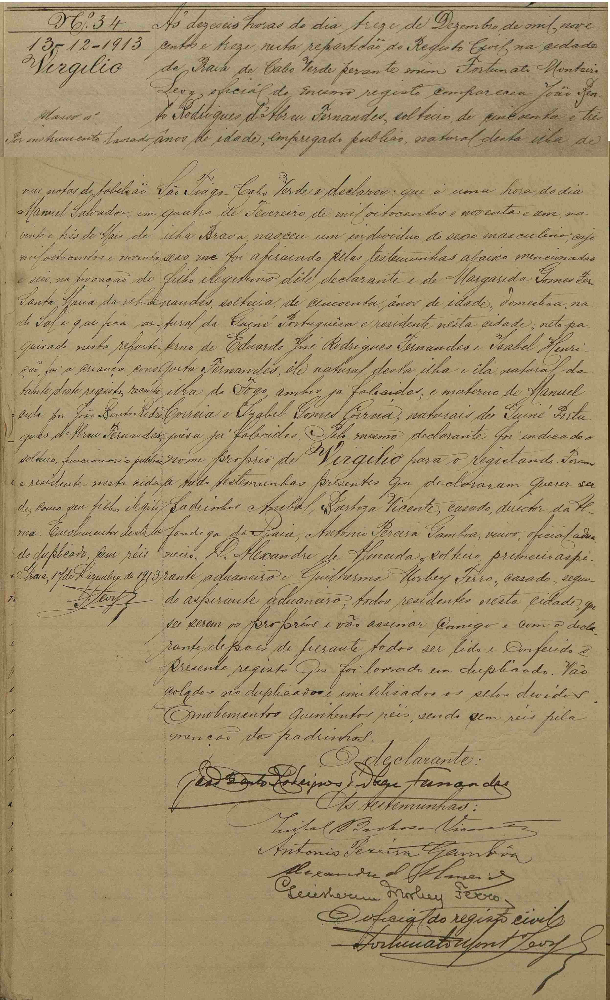 "Divulgados por FamilySearch," registo nº 34 da Repartição do Registo Civil; Arquivo Nacional de Cabo Verde, Praia. Data cit.: 13 Dez 1913; clique aqui