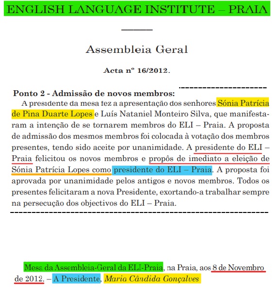 • Cargo: foi Presidente da Escola ELI de língua inglesa, a 8 Nov 2012 em Cidade da Praia, Ilha de Santiago, Cabo Verde