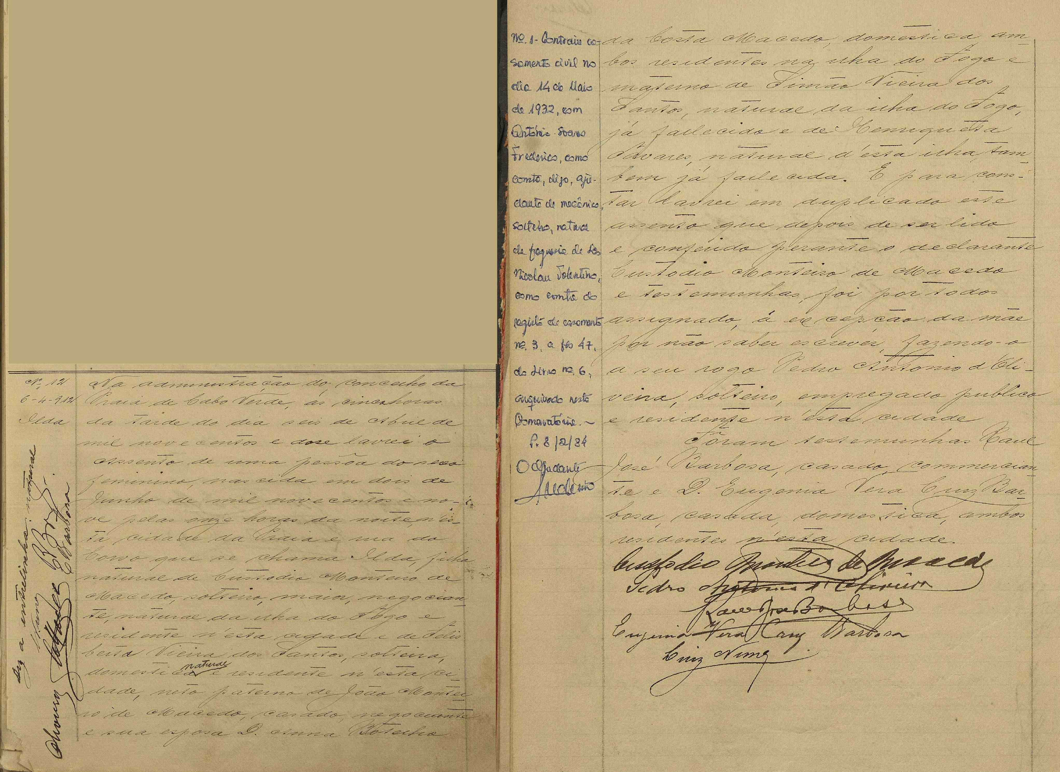 "Divulgados por FamilySearch," registo nº 12 da Repartição do Registo Civil (averbamento no registo da esposa Ilda); Arquivo Nacional de Cabo Verde, Praia. Data cit.: 6 Abr 1912; clique aqui
