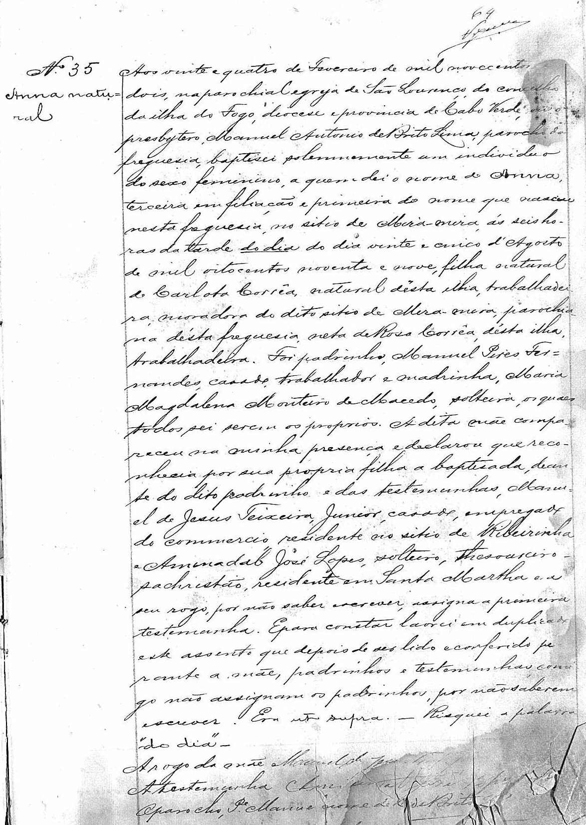 "Divulgados por FamilySearch," Número do Filme: 007031405 registo nº26; imagens 16 e 17; Arquivo Nacional de Cabo Verde, Praia. Data cit.: 20 Jun 1929; clique aqui