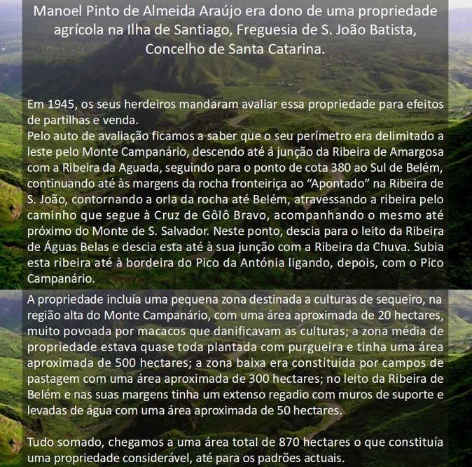 • Possuía agrícola em São João Baptista, Praia, Santiago, Cabo Verde. • Categoria / função laboral: negociante, em 1872. Manuel casou com Maria PEREIRA DE BORJA ®, filha de António PEREIRA DE BORJA e Arcângela Maria da LUZ, cerca de 1860 em Mindelo, (Nossa Srª da Luz) São Vicente, Cabo Verde. (Maria PEREIRA DE BORJA ® nasceu em 1832 na Ilha do Maio, Cabo Verde e faleceu a 6 Fev 1872 na Cidade da Praia, Ilha de Santiago, Cabo Verde.) |