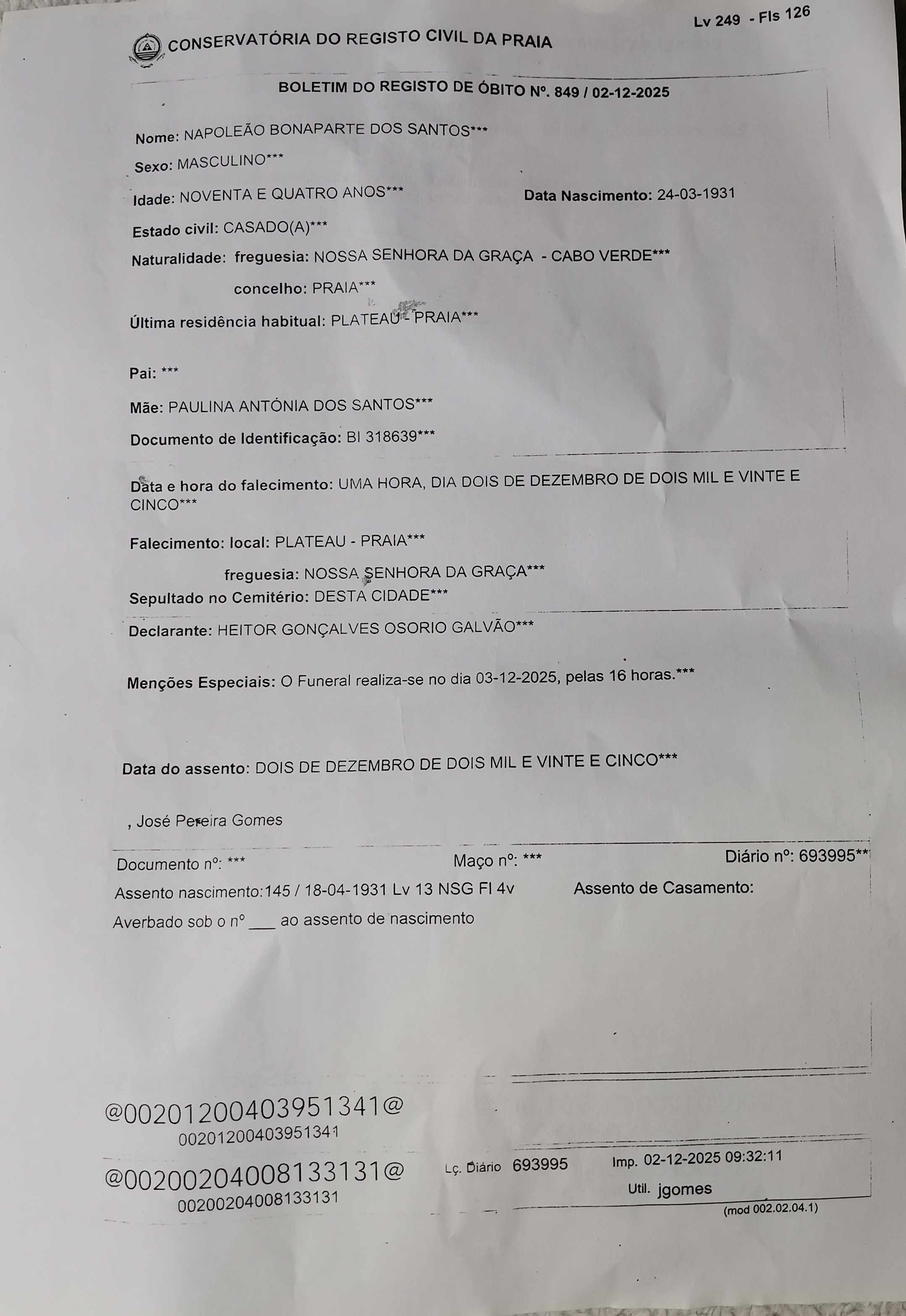• Foto aniversário: em companhia da mulher e dos filhos, 24 Mar 2021. 4 • Homenagem/Louvor/Reconhecimento: Diaporama sobre sua vida, em comemoraçã do seu 90º aniversário, a 24 Mar 2021. link youtube: clique aqui • O seu obituário foi publicado. A esposa e os filhos informam, com profunda dor, o falecimento do nosso querido Napoleão Bonaparte dos Santos. Partiu serenamente, deixando um legado de bondade, humildade e afeto que continuará vivo em cada memória que guardamos dele. A sua ausência abre um vazio imenso, mas também reforça a gratidão por tudo o que nos deu em vida . Ficam as boas recordações e o seu sorriso apaziguador, o espírito generoso e a forma discreta com que sempre cuidou dos que ama. A família informa que estará a receber as condolências a partir de amanhã, 3 de dezembro, pelas 10h00, no Salão da Juventude da Igreja do Nazareno. O corpo será velado na Igreja do Nazareno, no mesmo dia, a partir das 15h00, seguido do respetivo culto . O cortejo fúnebre seguirá posteriormente a partir da própria Igreja do Nazareno. A família agradece, desde já, todas as manifestações de solidariedade, carinho e oração neste momento de profunda tristeza. • Exéquias: Cerimónia Funebre na Igreja do Nazareno no Plateau, a 3 Dez 2025, na Cidade da Praia, Ilha de Santiago, Cabo Verde. • Elogio fúnebre: por Alvaro Ludgero Andrade no facebook.