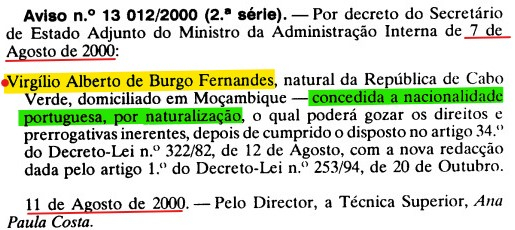 • Foi naturalizado a 11 Ago 2000. • O seu obituário foi publicado em relato sobre o conteúdo de uma nota de pesar em Ago 2010. Através de um comunicado assinado pela Ministra da Presidência do Conselho de Ministros e dos Assuntos Parlamentares, o Governo de Cabo Verde manifestou o seu profundo pesar pelo falecimento de Virgílio Fernandes. No mesmo comunicado o Governo acrescenta: O nome de Virgílio Fernandes ficará para sempre associado à causa da independência de Cabo Verde e da liberdade que ele abraçou desde a sua juventude. Um dos primeiros economistas de Cabo Verde, Virgilio Fernandes contribuiu de forma valiosa para o lançamento das bases para a construção do Estado e para o desenvolvimento de Cabo Verde, tendo desempenhado altas funções na Administração Pública, como Director Geral do Planeamento e Secretário de Estado das Finanças" nos primeiros anos da independência. • Morava em Moçambique. Aquando de seu falecimento Virgílio casou com Ester Fernandes de MENDONÇA ®, filha de Gregório Pereira Furtado MENDONÇA e Geralda Dias FERNANDES. O casamento acabou em divórcio. (Ester Fernandes de MENDONÇA ® nasceu a 21 Out 1953 na Cidade da Praia, Ilha de Santiago, Cabo Verde 3.)