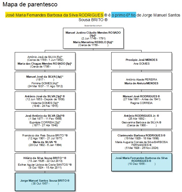 4) Os nomes seguidos de um asterisco (*) são os dos ascendentes diretos de Jorge Sousa Brito. Assim, ao navegar em linha ascendente a partir de um nome e encontrar um com (*), saberá que este é dum antepassado comum de JSB e do portador do nome donde partiu.