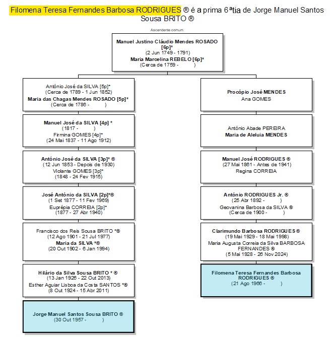4) Os nomes seguidos de um asterisco (*) são os dos ascendentes diretos de Jorge Sousa Brito. Assim, ao navegar em linha ascendente a partir de um nome e encontrar um com (*), saberá que este é dum antepassado comum de JSB e do portador do nome donde partiu.