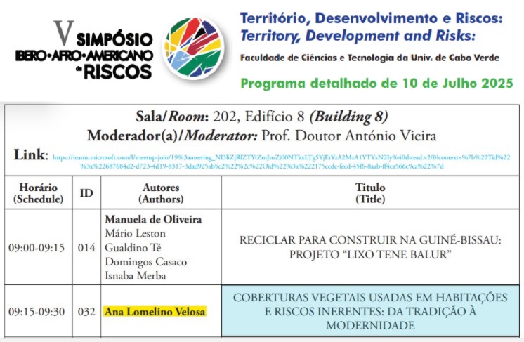 • Participação em evento / certame: V Simpósio Ibero-Afro-Americano de Riscos, em Jul 2025, na Cidade da Praia, Ilha de Santiago, Cabo Verde. 1 |