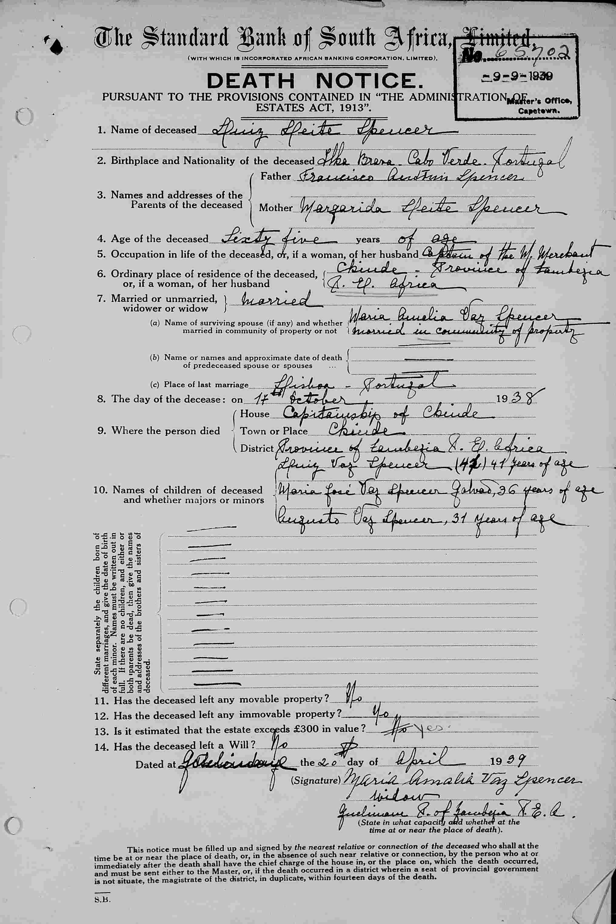 • Faleceu certidão. Luiz casou com Maria Amália de Oliveira VAZ em Santos o Velho, Lisboa, Portugal. (Maria Amália de Oliveira VAZ faleceu em †.) |