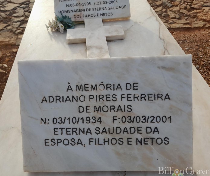 • Foi sepultado ou cremado no Cemitério Municipal do Mindelo no Mindelo, (Nossa Srª da Luz) São Vicente, Cabo Verde. Adriano casou com Maria Palmira Nobre de Oliveira VERA-CRUZ ®, filha de Henrique José VERA-CRUZ ® e Maria Antonina Nobre de OLIVEIRA ®. (Maria Palmira Nobre de Oliveira VERA-CRUZ ® nasceu a 31 Dez 1940 em Paúl, Santo Antão, Cabo Verde.) |