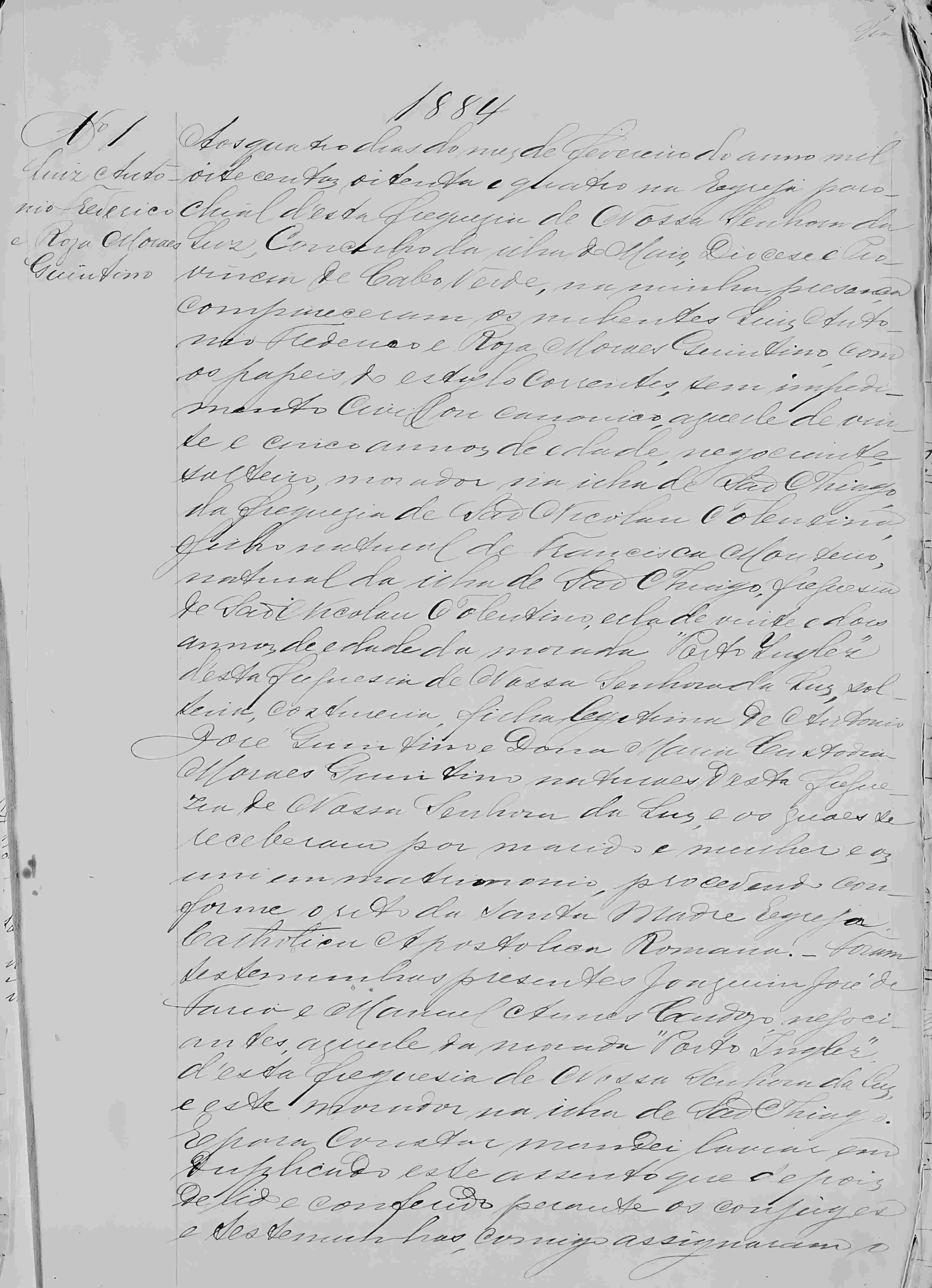 • Rosa casou a 4 Fev 1884. Cf. ao lado o recorte do registo de casamento • Trabalhou como costureira em 1890 em Nossa Senhora da Luz, Maio, Cabo Verde. 1 • Ocupação: proprietária, em 1893, em Nossa Senhora da Luz, Maio, Cabo Verde. 2 Rosa casou com Luís António FREDERICO, filho de José António FREDERICO e Francisca MONTEIRO, a 4 Fev 1884 em Nossa Senhora da Luz, Maio, Cabo Verde. (Luís António FREDERICO nasceu em 1859 em São Nicolau Tolentino, São Domingos, Cabo Verde, faleceu depois de 1917 em Nossa Senhora da Luz, Maio, Cabo Verde e foi sepultado em Nossa Senhora da Luz, Maio, Cabo Verde.) |