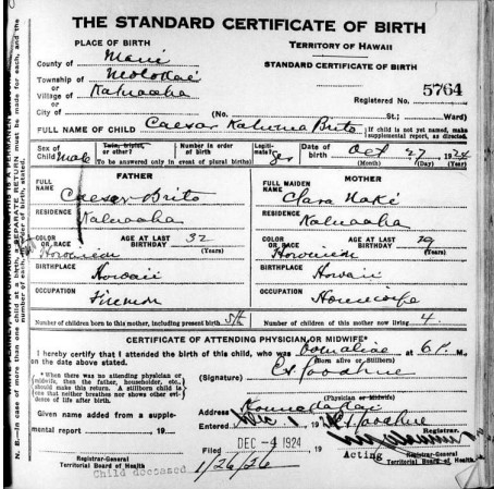 Nascimento: 27 de out de 1924 - Mapulehu, Molokai, Hawaii, United States