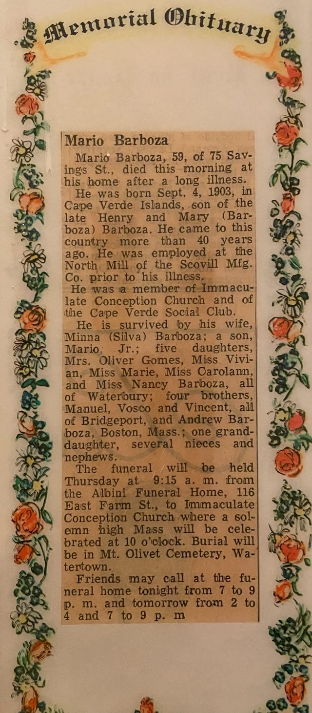 • Sepultura/Campa: 1962, em Watertown, Litchfield, Connecticut, United States. Mário casou com Minna Agnes SILVA ®, filha de Severino José da SILVA ® e Benvinda RODRIGUES ®, a 20 Jan 1936 em Port Chester, Westchester, New York, United States. (Minna Agnes SILVA ® nasceu a 11 Fev 1917 em Canton, Norfolk, Massachusetts, Estados Unidos da América,2 faleceu a 2 Jan 1992 em Waterbury, New Haven, Connecticut, United States 2 e foi sepultada em Watertown, Litchfield, Connecticut, United States.) |