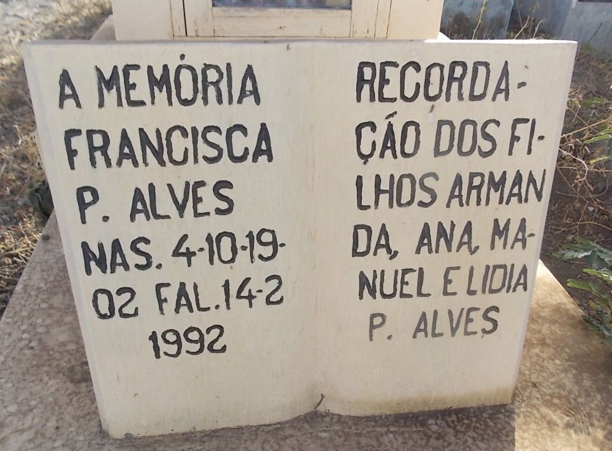 2 "Find a Grave," database ( accessed 7 Nov 2025); Find a Grave, banco de dados e imagens (https://pt.findagrave.com/memorial/186847678/francisca_p-alves: acessado 7 de novembro de 2025), página do memorial para Francisca P Alves (4 Out 1902\endash 14 Fev 1992), ID de Memorial do Find a Grave 186847678, citando São Lourenço Cemiterio, Sao Filipe, São Filipe, Cape Verde; Mantido por Alan and Linda Martineau (colaborador 49360097).