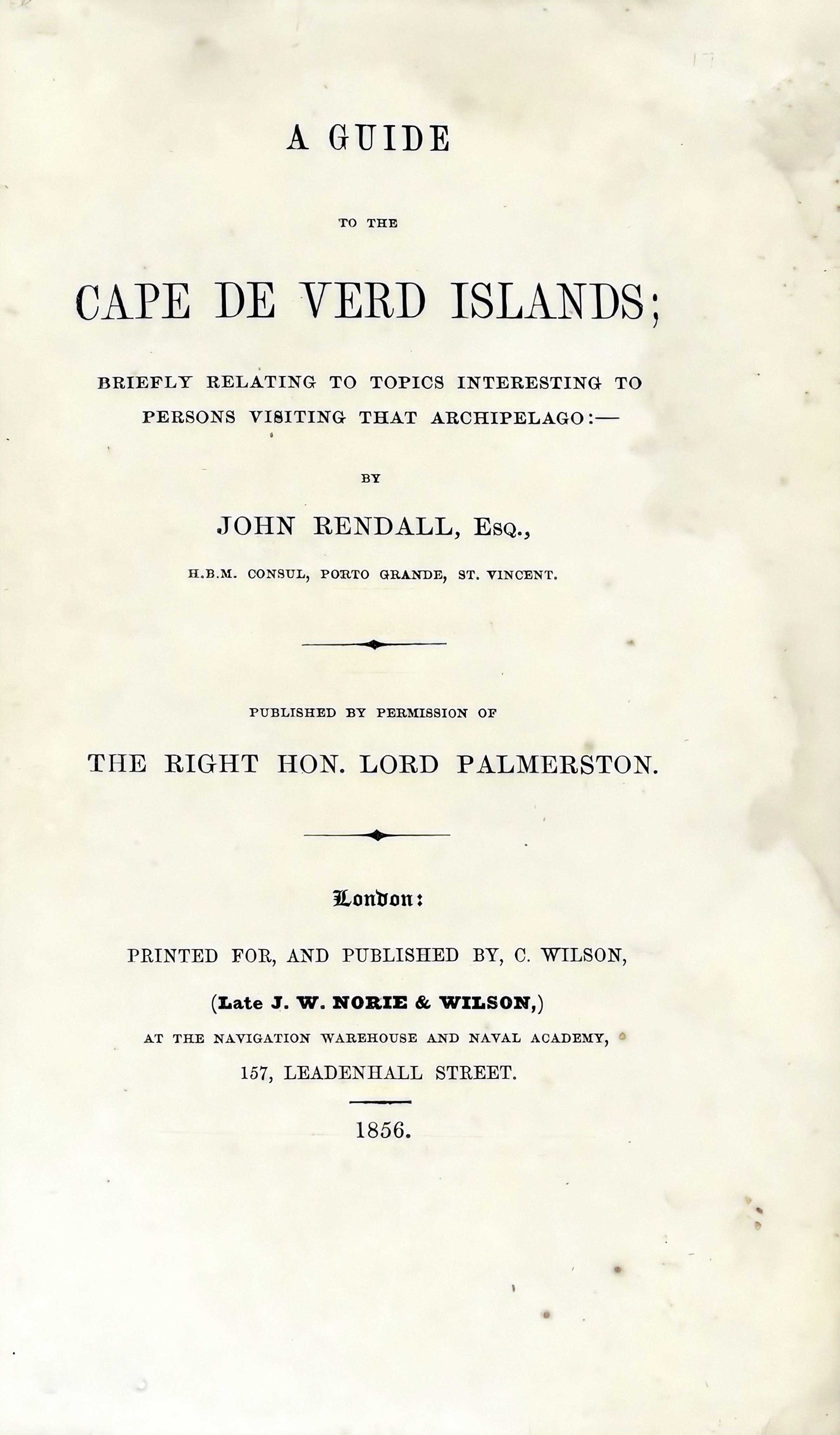 • Nota biográfica:,. Epitáfio no túmulo de John Rendall, que foi Cônsul da Inglaterra em Cabo Verde e se encontra sepultado no cemitério do Mindelo: Sacred to the memory of JOHN RENDALL ESQ. H. B. Magesty's Consul of the Cape Verde Island who departed this life 30 Nov 1854, aged 59, after a period of 43 years of service on the Peninsular Coast of Africa & North America. • O que se conta desta pessoa: por Rosário Wadie em comentário no facebook. He arrived in Boavista before 1840 as by that date he was named British Consul there. September 1845 was the start of a great yellow fever epidemy that killed many hundreds & spoilt the economy of the island so in December he moved to St. Antao, to a place called Carvoeiros that is today Porto Novo. After around 6 years or so he moved to S. Vicente where he opened a coal deposit to supply ships en route to South Africa & beyond. He was one of the first to do so. By 1853 he had built his own house there in the street just behind the Customs House that still exists today. His house was demolished only in 1938. My great great-grandfather Antonio Joaquim Martins had the house next door to him. Married to Gertrudes Rendall who died of cholera in 1856. They may have had other children but the ones I heard of were John, George, Augusto & Robert. • Morava em Prospect Buildings, Old Chard em 1841 em Chard, , Somerset, Inglaterra. 2 • Descendência. filhos: