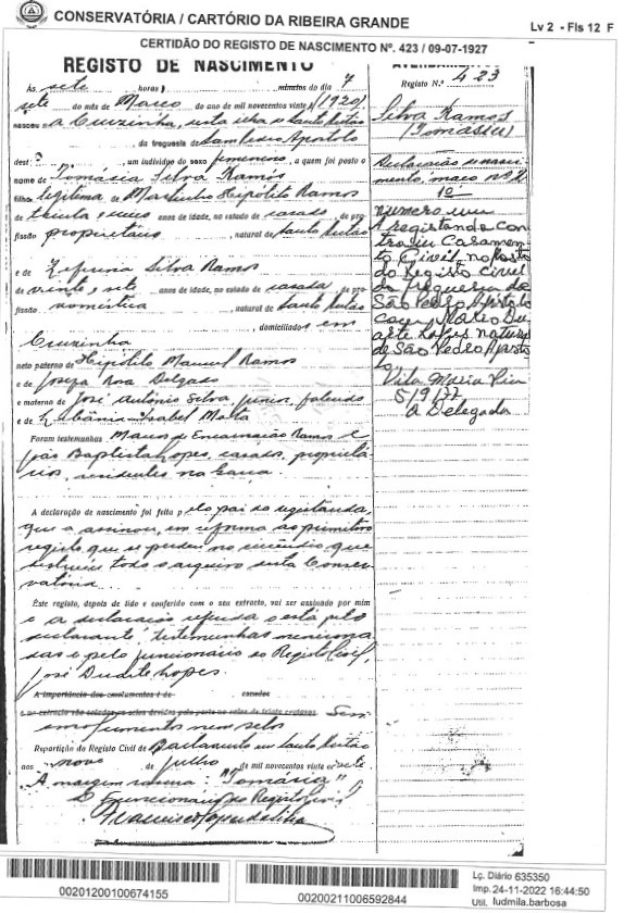 • Registo de nascimento/baptismo: 29 Jul 1927. Tomásia casou com Mário Duarte LOPES ®, filho de José Duarte LOPES ® e Maria Ana LOPES ®, a 15 Jul 1939 em São Pedro Apóstolo, Ribeira Grande, Santo Antão, Cabo Verde. O casamento acabou em divórcio a 1 Out 1947. (Mário Duarte LOPES ® nasceu a 23 Mar 1915 em Chã d' Igreja, São Pedro Apóstulo, Santo Antão, Cabo Verde,1 faleceu a 13 Set 2008 no Mindelo, (Nossa Srª da Luz) São Vicente, Cabo Verde 1 e foi sepultado em Set 2008 no Mindelo, (Nossa Srª da Luz) São Vicente, Cabo Verde.)