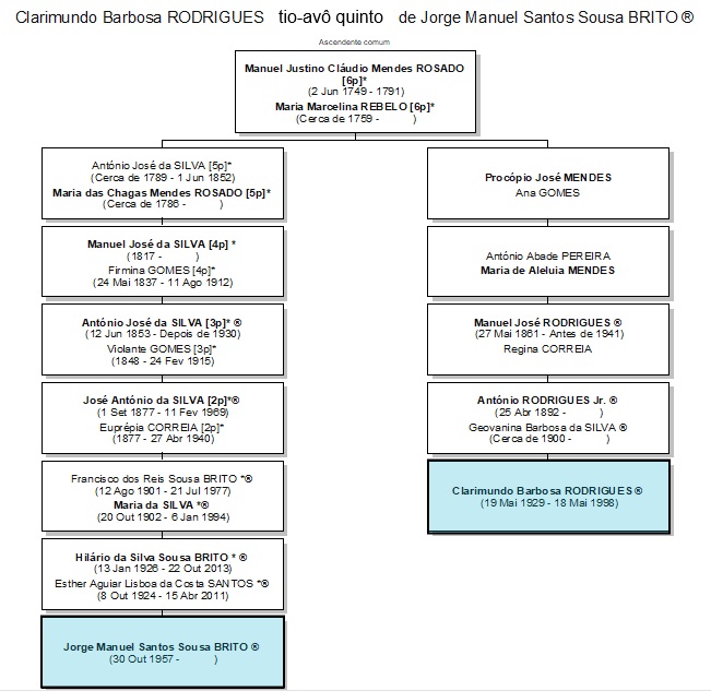 4) Os nomes seguidos de um asterisco (*) são os dos ascendentes diretos de Jorge Sousa Brito. Assim, ao navegar em linha ascendente a partir de um nome e encontrar um com (*), saberá que este é dum antepassado comum de JSB e do portador do nome donde partiu.