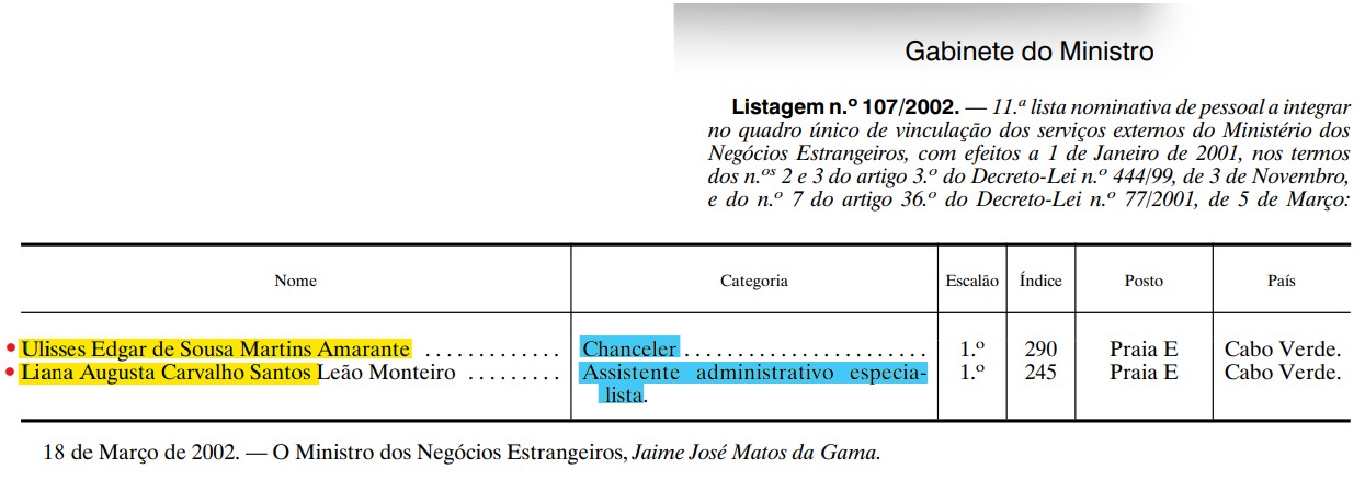 • Categoria / função laboral: depois de 18 Mar 2002 era Assistente administrativo especialista da embaixada de Portugal, em Cabo Verde. Liana casou com João Augusto Barbosa Leão MONTEIRO ®, filho de João Rodrigues MONTEIRO ® e Idalina Nunes Barbosa LEÃO ®. (João Augusto Barbosa Leão MONTEIRO ® nasceu a 11 Jun 1960 na Cidade da Praia, Ilha de Santiago, Cabo Verde.) |