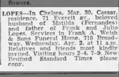 • O seu obituário foi publicado. 1 Cesário casou com Dorothy Alice PORTRAIT, filha de Georges Ferdinand PORTRAIT e Mary GOODMAN ®, a 14 Abr 1935 em East Boston, Suffolk, Massachusetts, Estados Unidos da América. O casamento acabou em divórcio. (Dorothy Alice PORTRAIT nasceu a 8 Jun 1918 em East Boston, Suffolk, Massachusetts, Estados Unidos da América 2 e faleceu a 2 Jul 1980 in Boston, Suffolk, Massachusetts, Estados Unidos da América 2.)