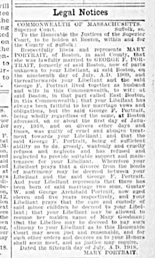 Summary: Mary Portrait files for divorce from George F. Portrait, requesting custody of their two sons and alimony.
