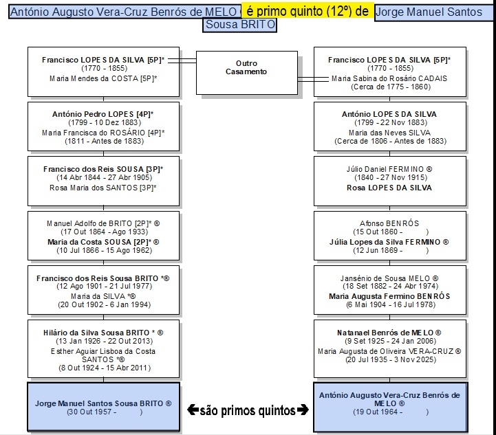 4) Os nomes seguidos de um asterisco (*) são os dos ascendentes diretos de Jorge Sousa Brito. Assim, ao navegar em linha ascendente a partir de um nome e encontrar um com (*), saberá que este é dum antepassado comum de JSB e do portador do nome donde partiu.