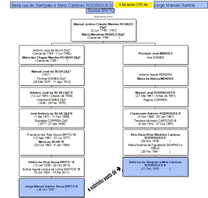 4) Os nomes seguidos de um asterisco (*) são os dos ascendentes diretos de Jorge Sousa Brito. Assim, ao navegar em linha ascendente a partir de um nome e encontrar um com (*), saberá que este é dum antepassado comum de JSB e do portador do nome donde partiu.