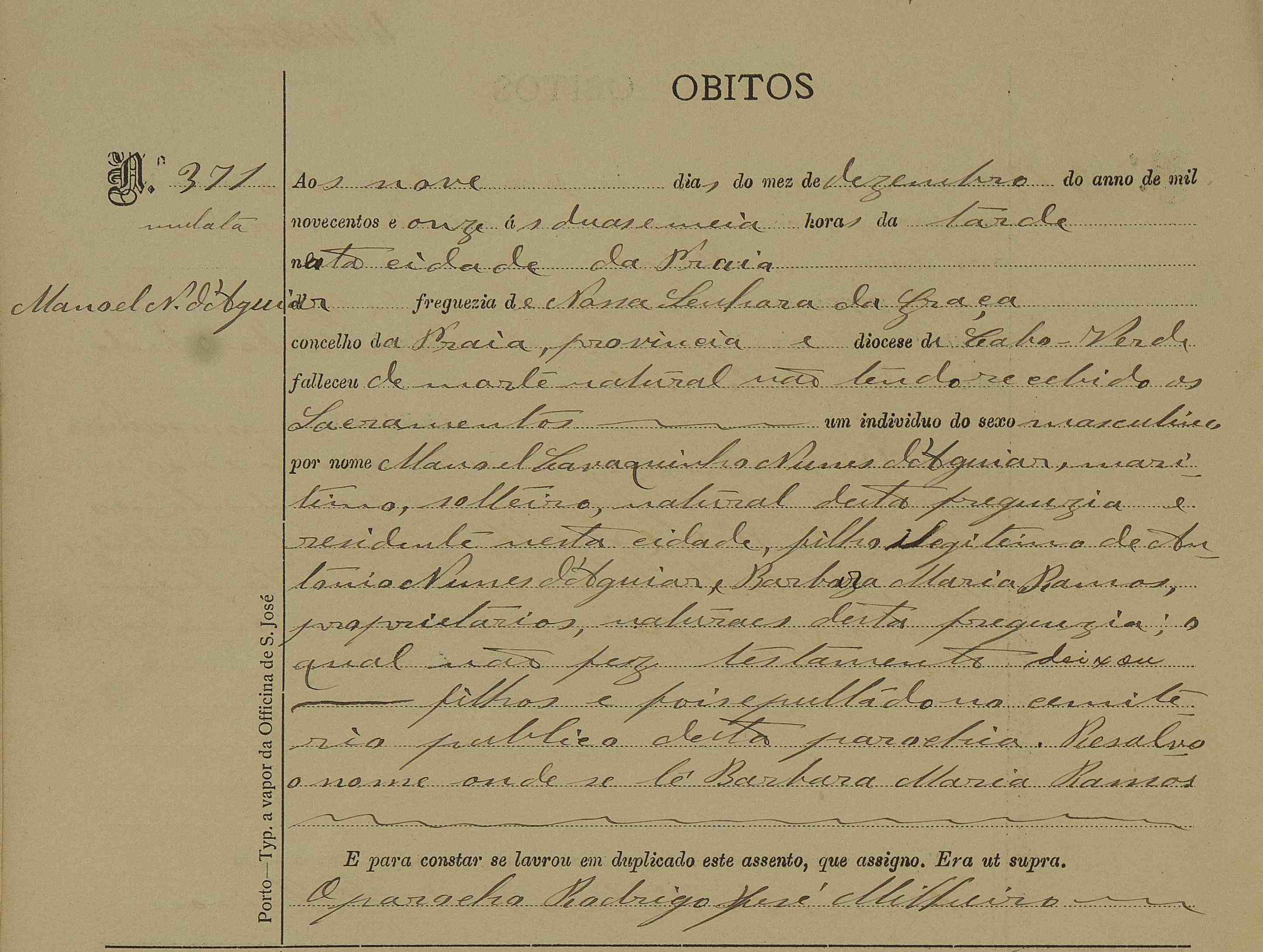 "Divulgados por FamilySearch," registo de óbito nº371; Arquivo Nacional de Cabo Verde, Praia; clique aqui