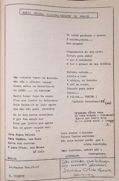 • Caricatura / desenho: aquando do II Curso de Estudos Portugueses de Cabo Verde, em Abr 1973, no Mindelo, (Nossa Srª da Luz) São Vicente, Cabo Verde. Fora um mini-curso do Círculo de Estudos Portugueses, ministrado nas férias da Páscoa e destinado a um grupo selecionado entre os melhores alunos liceais.