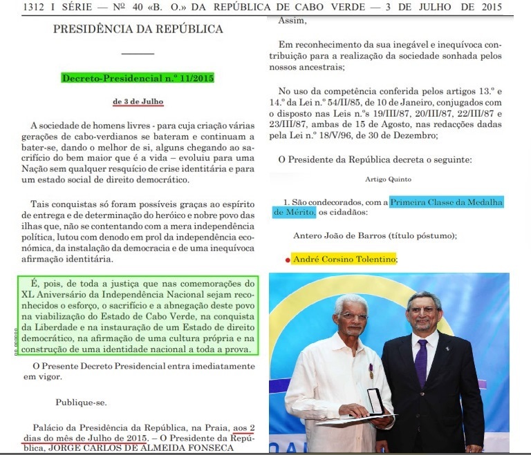 • Condecoração: Primeira Classe da Medalha de Mérito, a 3 Jul 2015, em Cabo Verde.