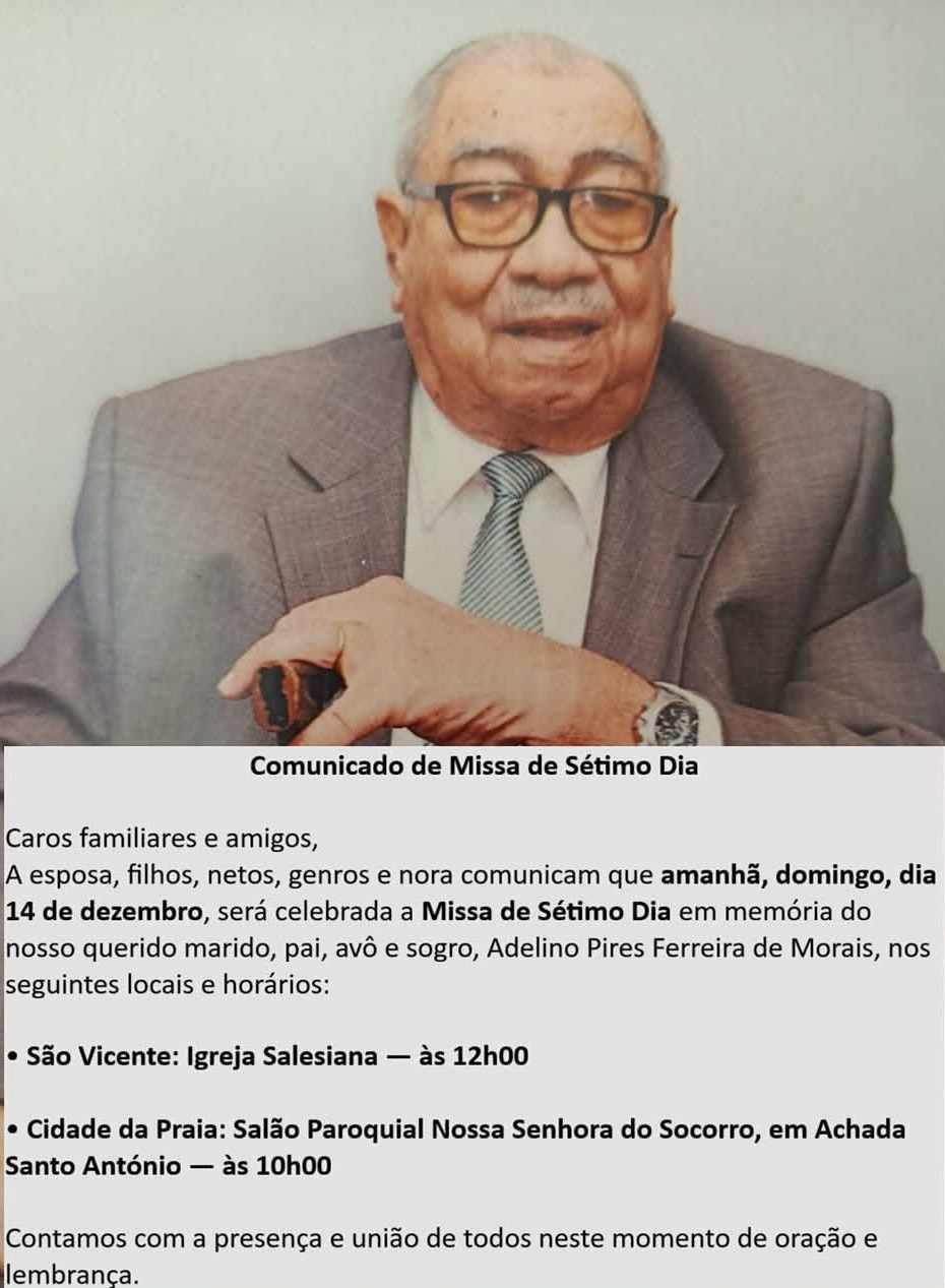 • O seu obituário foi publicado em Missa de Sétimo Dia a 14 Dez 2025 no Mindelo, (Nossa Srª da Luz) São Vicente, Cabo Verde. Adelino casou com Alexandra Maria GUILHERME. Adelino a seguir casou com Maria Regina Mendes FONSECA ®, filha de Armando Brito FONSECA ® e Luzia Alcina Barbosa MENDES ®, a 13 Mar 1971 no Mindelo, (Nossa Srª da Luz) São Vicente, Cabo Verde. (Maria Regina Mendes FONSECA ® nasceu a 30 Dez 1939 na Cidade da Praia, Ilha de Santiago, Cabo Verde 1.) |