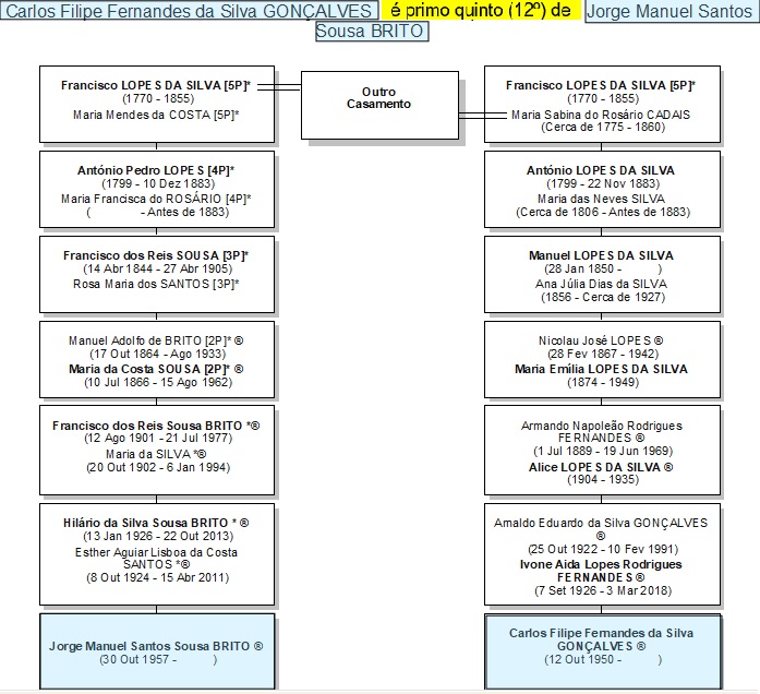 4) Os nomes seguidos de um asterisco (*) são os dos ascendentes diretos de Jorge Sousa Brito. Assim, ao navegar em linha ascendente a partir de um nome e encontrar um com (*), saberá que este é dum antepassado comum de JSB e do portador do nome donde partiu.