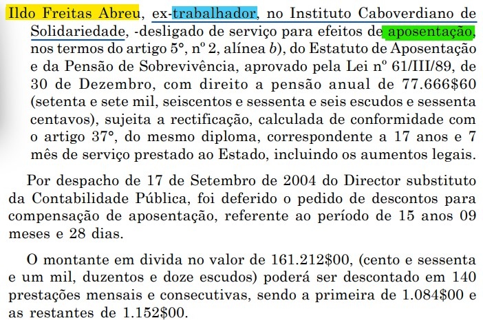 • Aposentou-se como trabalhador do Instituto Cabo-verdiano de Solidariedade a 7 Jun 2006. Ildo teve uma relação com Maria José SILVA. (Maria José SILVA nasceu em 1932 em São João Baptista, Ilha Brava, Cabo Verde.) Ildo a seguir casou com Maria José Cabral SEMEDO, filha de Desconhecido e Maria Cabral SEMEDO. (Maria José Cabral SEMEDO nasceu a 27 Set 1933 em Ns. Senhora da Graça, Praia, Santiago, Cabo Verde 1.) Ildo teve uma relação com ?. |