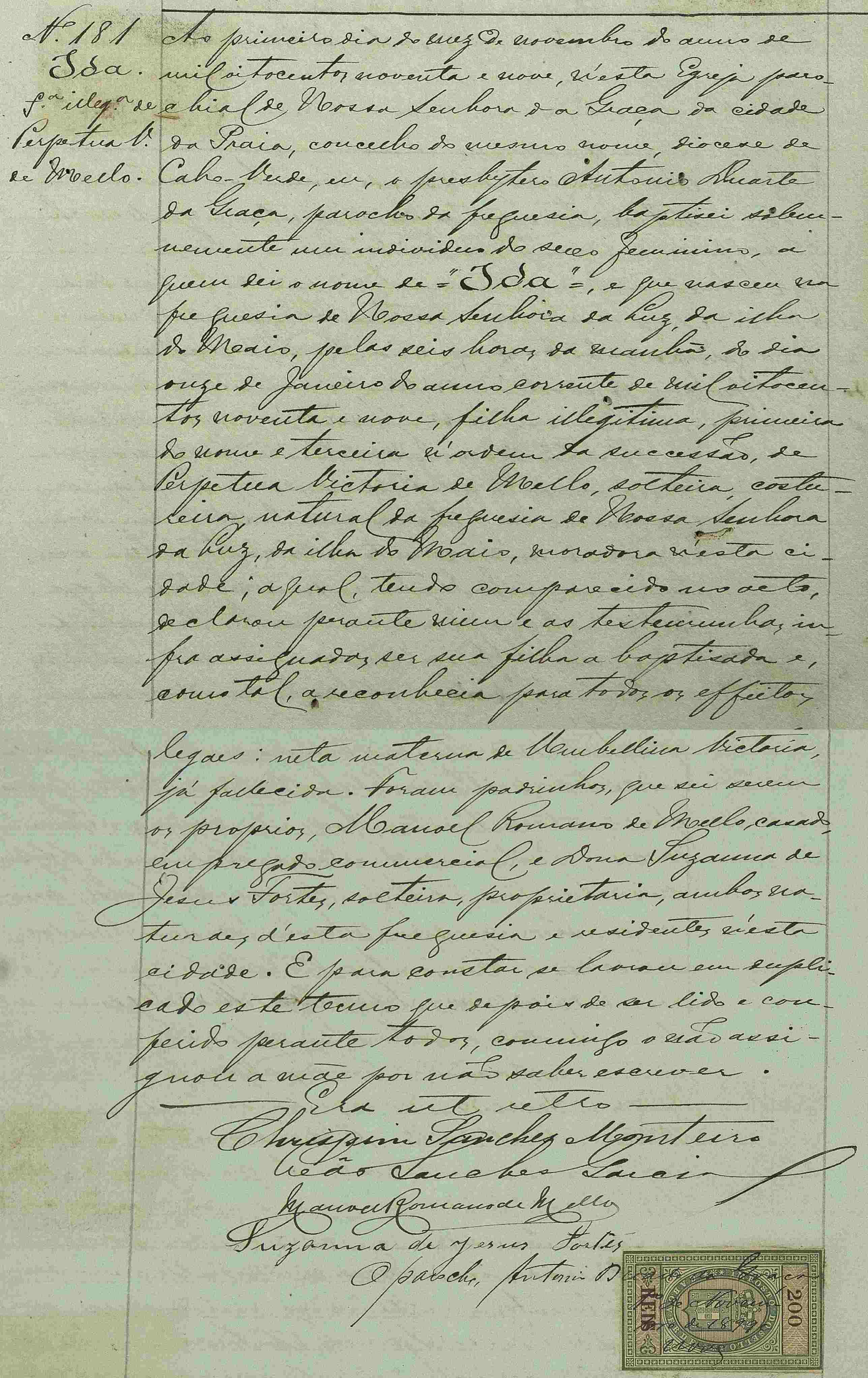 "Divulgados por FamilySearch," registo de baptismo nº 181 (1899); Arquivo Nacional de Cabo Verde, Praia; clique aqui