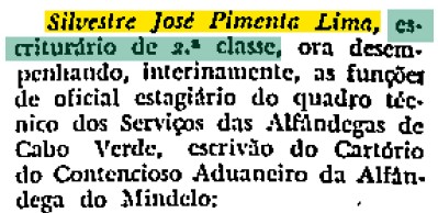 ![]() • Foto casal. O bébé é o filho José ![]() • Categoria / função laboral: em 1969 era escriturário de 2ª classe dos Serviços das Alfândegas, em Cabo Verde. ![]() • Categoria / função laboral: a 16 Jan 1975 era Oficial da Repartição dos Serviços das Alfandegas, na Cidade da Praia, Santiago, Cabo Verde. (Cf. ao lado, um extrato do B.O. nº4 de 25.1.1975) ![]() • Categoria / função laboral: Verificador da Repartição dos Serviços das Alfândegas, a 16 Jan 1975. (Cf. ao lado, um extrato do B.O. nº4 de 25.1.1975) ![]() • Foto 3ª idade: ![]() • Foi sepultado ou cremado no Cemitério Municipal do Mindelo em Cabo Verde. ![]() • Sepultura/Campa. ![]() Silvestre casou com Rosa Perpétua Antunes GOMES ®, filha de Raimundo João GOMES e Rosa ANTUNES ®. (Rosa Perpétua Antunes GOMES ® nasceu a 5 Fev 1941 em Mindelo, (Nossa Srª da Luz) São Vicente, Cabo Verde.) |