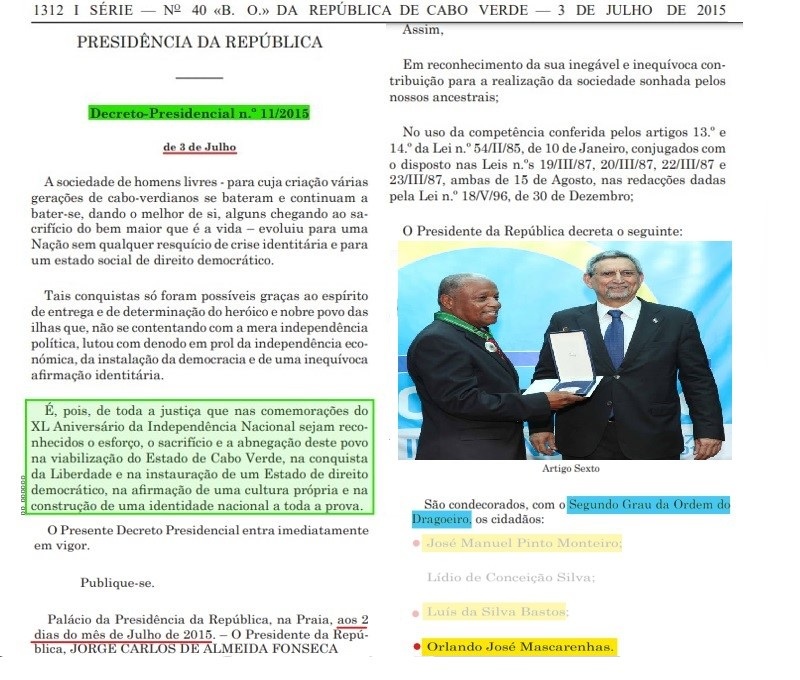 • Condecoração: com o Segundo Grau da Ordem do Dragoeiro, a 3 Jul 2015, em Cabo Verde. Ver na figura ao lado, o extrato do Decreto-Presidencial de 03.07.2015, publicado no BO nº 40, I Série de 03-07-2015 (página 1312) NB: todos os que estão assinalados com um ponto vermelho e realçados a amarelo, têm uma página genealógica nesta árvore.