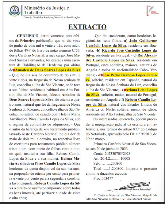 • Condolências ou Agradecimento de condolências: agradecimentos, a 6 Dez 2023,. Amadeu teve uma relação com Maria Fernanda da Conceição BARBOSA ®, filha de Fernando José BARBOSA ® e Maria Alice da Conceição LOPES ®. (Maria Fernanda da Conceição BARBOSA ® nasceu a 4 Jan 1947 no Mindelo, (Nossa Srª da Luz) São Vicente, Cabo Verde.) Amadeu teve uma relação com Maria Helena Andrade Modesto LEITE ®, filha de Paulo Brito LEITE ® e Joana Guiomar Andrade MODESTO ®. (Maria Helena Andrade Modesto LEITE ® nasceu a 9 Abr 1962 em Nossa Senhora do Livramento, Ribeira Grande, Santo Antão, Cape Verde 2.) |