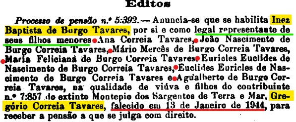 • Atribuído uma pensão. Inês casou com Gregório Correia TAVARES ®, filho de Leandro Correia TAVARES e Inocência Maria Monteiro BARRETO. (Gregório Correia TAVARES ® nasceu na Ilha de Santiago, Cabo Verde e faleceu a 13 Jan 1944 em †.) |