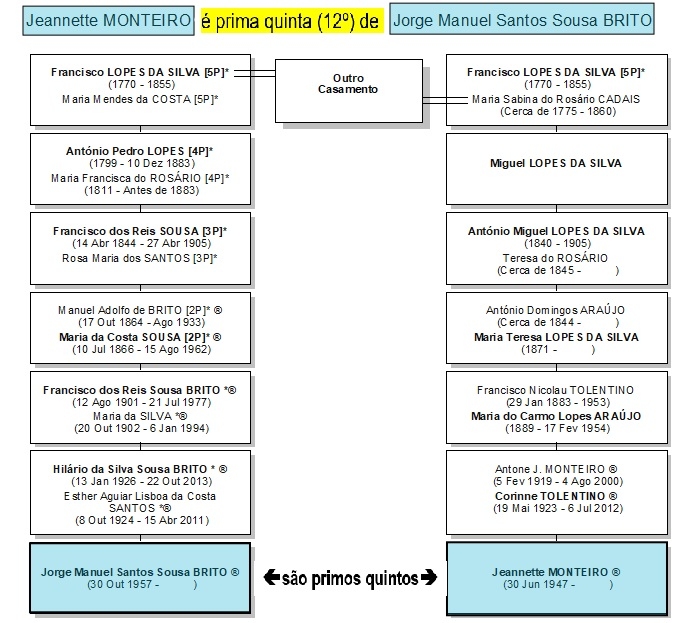 4) Os nomes seguidos de um asterisco (*) são os dos ascendentes diretos de Jorge Sousa Brito. Assim, ao navegar em linha ascendente a partir de um nome e encontrar um com (*), saberá que este é dum antepassado comum de JSB e do portador do nome donde partiu.