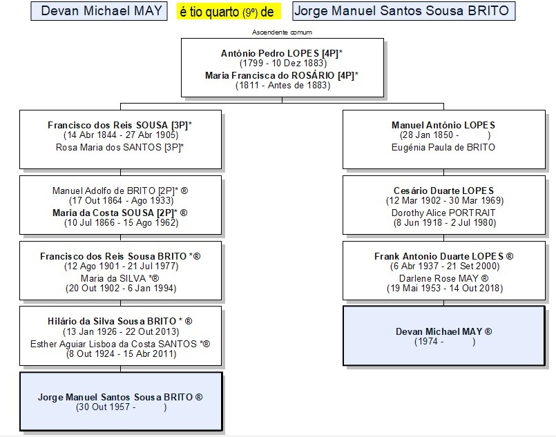 4) Os nomes seguidos de um asterisco (*) são os dos ascendentes diretos de Jorge Sousa Brito. Assim, ao navegar em linha ascendente a partir de um nome e encontrar um com (*), saberá que este é dum antepassado comum de JSB e do portador do nome donde partiu.