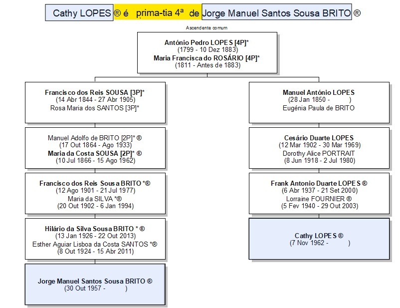 4) Os nomes seguidos de um asterisco (*) são os dos ascendentes diretos de Jorge Sousa Brito. Assim, ao navegar em linha ascendente a partir de um nome e encontrar um com (*), saberá que este é dum antepassado comum de JSB e do portador do nome donde partiu.