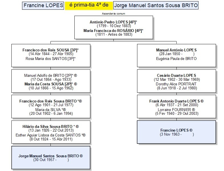 4) Os nomes seguidos de um asterisco (*) são os dos ascendentes diretos de Jorge Sousa Brito. Assim, ao navegar em linha ascendente a partir de um nome e encontrar um com (*), saberá que este é dum antepassado comum de JSB e do portador do nome donde partiu.