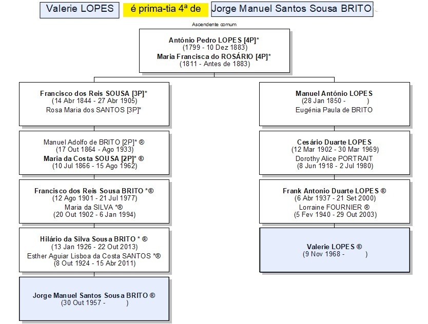 4) Os nomes seguidos de um asterisco (*) são os dos ascendentes diretos de Jorge Sousa Brito. Assim, ao navegar em linha ascendente a partir de um nome e encontrar um com (*), saberá que este é dum antepassado comum de JSB e do portador do nome donde partiu.