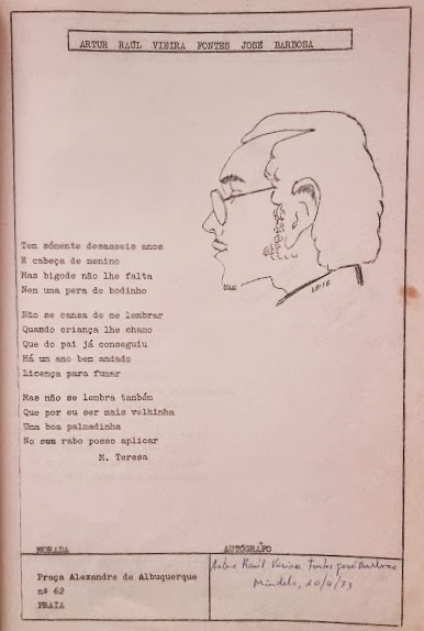 • Caricatura / desenho: aquando do II Curso de Estudos Portugueses de Cabo Verde, em Abr 1973, em Mindelo, (Nossa Srª da Luz) São Vicente, Cabo Verde. Fora um mini-curso do Círculo de Estudos Portugueses, ministrado nas férias da Páscoa e destinado a um grupo selecionado entre os melhores alunos liceais.