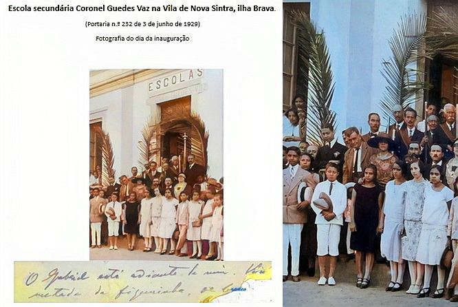 • Foto cerimónia/evento: Inauguração da Escola secundária Coronel Guedes Vaz, em 1929, na Nova Sintra, Ilha Brava, Cabo Verde. Fotografias onde Eugénio Tavares indica onde se encontra o filho Gabriel (atrás do rapazinho de branco, pode-se aperceber uma criancinha com metade da cara escondida)